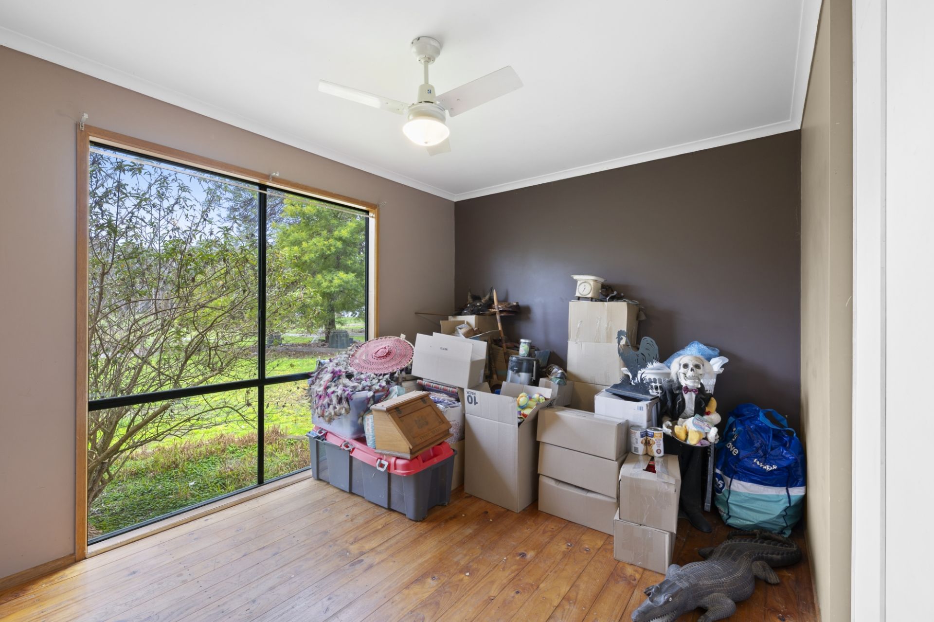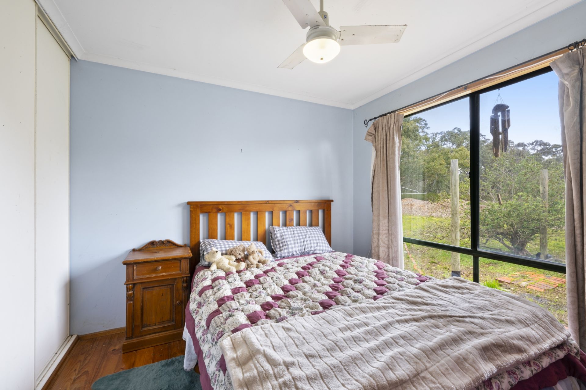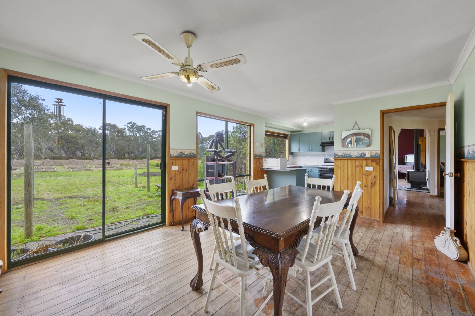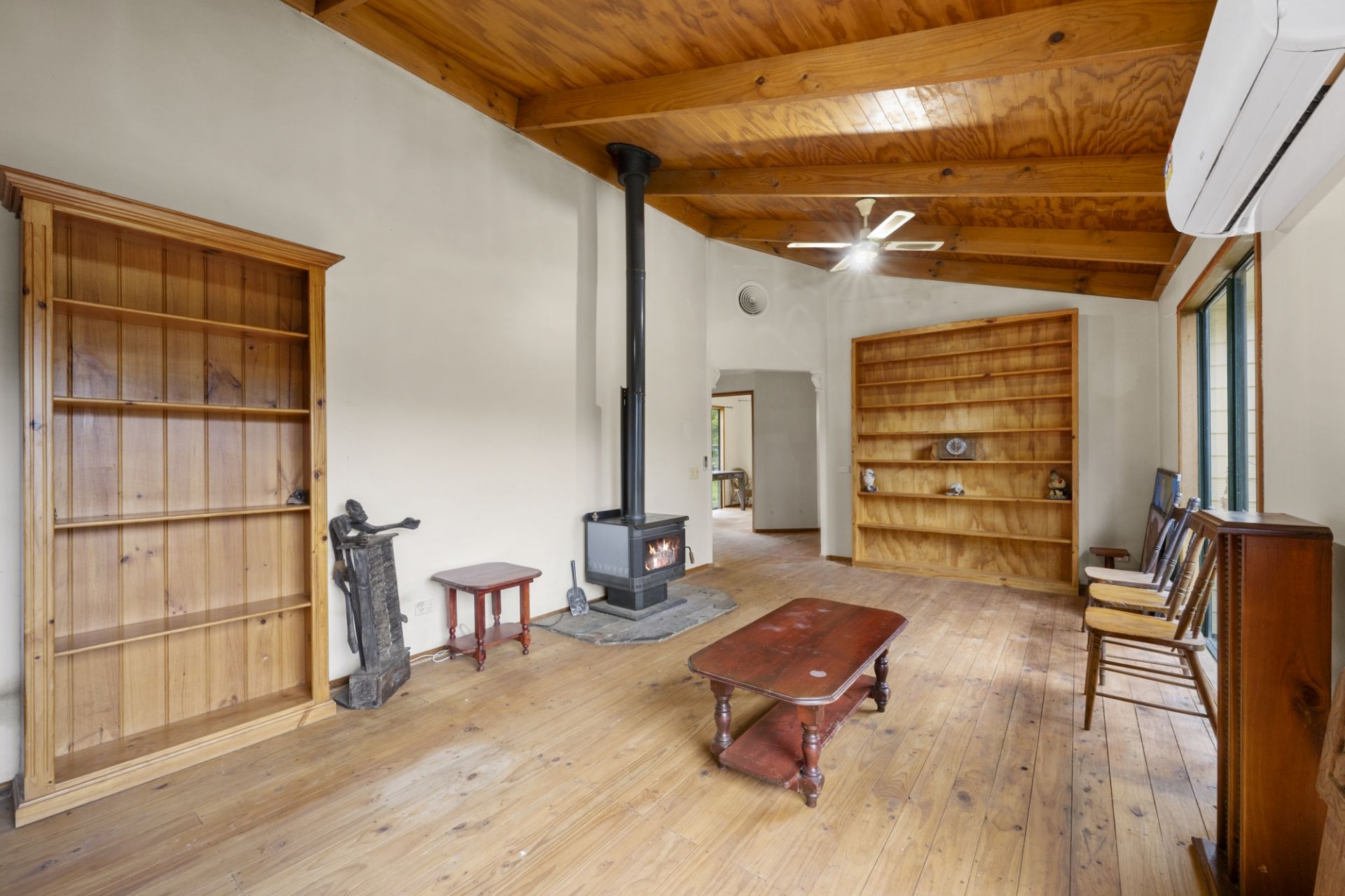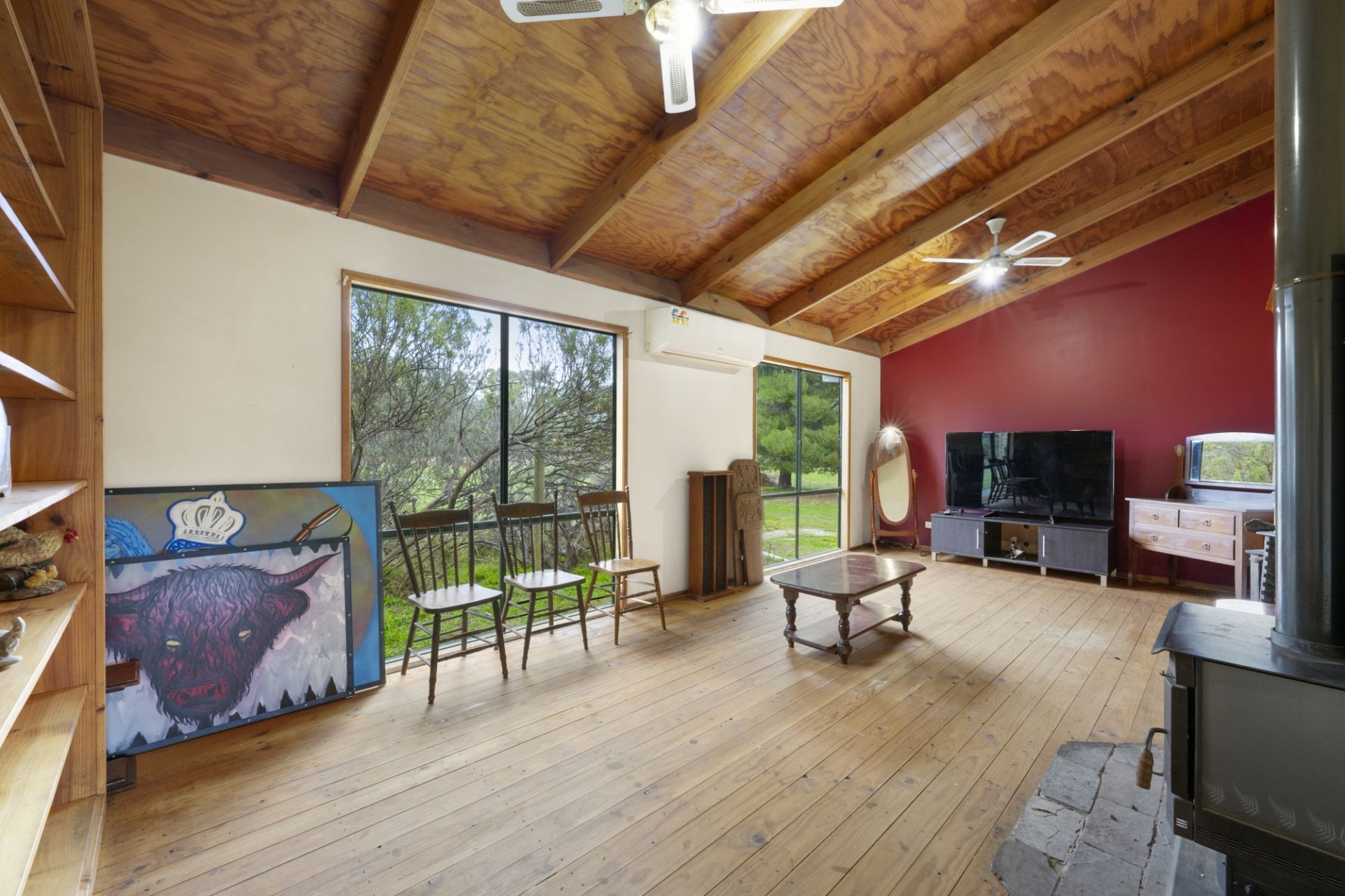The residence features three generous bedrooms, including a master with built-in robes and ensuite, plus a fourth bedroom or study for added flexibility. Enjoy the warmth and charm of the spacious living room, complete with floorboards, timber cathedral ceilings, large windows that flood the space with natural light, a cosy wood fire with heat transfer system, and split system for heating/cooling.