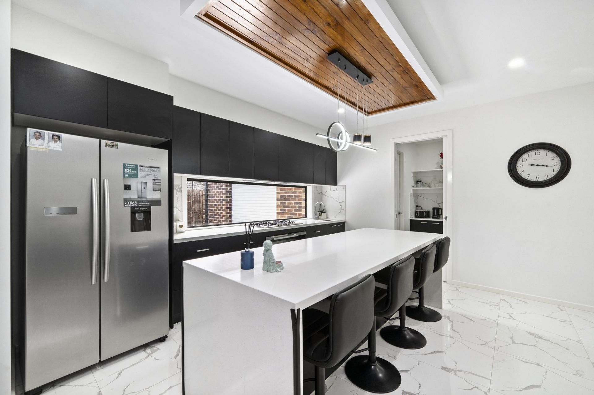 The large open plan living, dining and kitchen to the rear of the home, is perfect for family gatherings. The stunning chef's kitchen offers a massive butlers pantry with a dishwasher, beautiful stone benchtops with waterfall edges, gas cooktop and an electric oven.