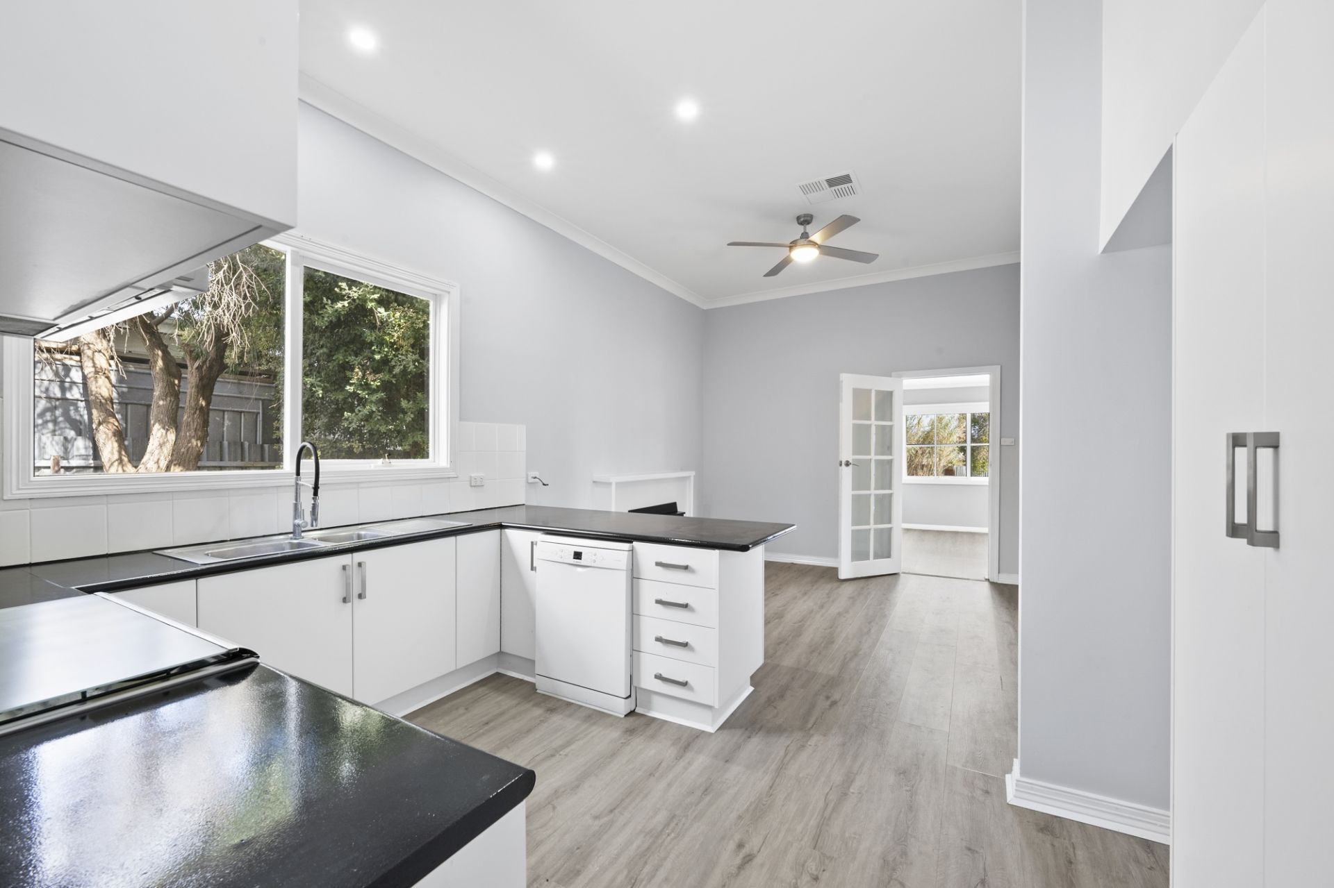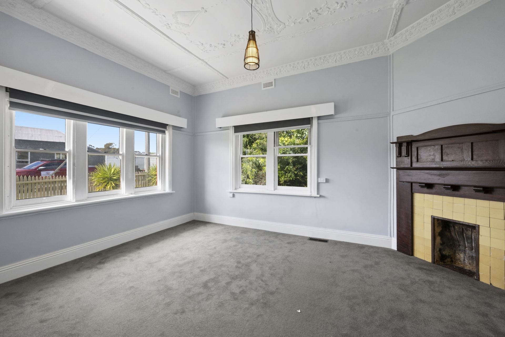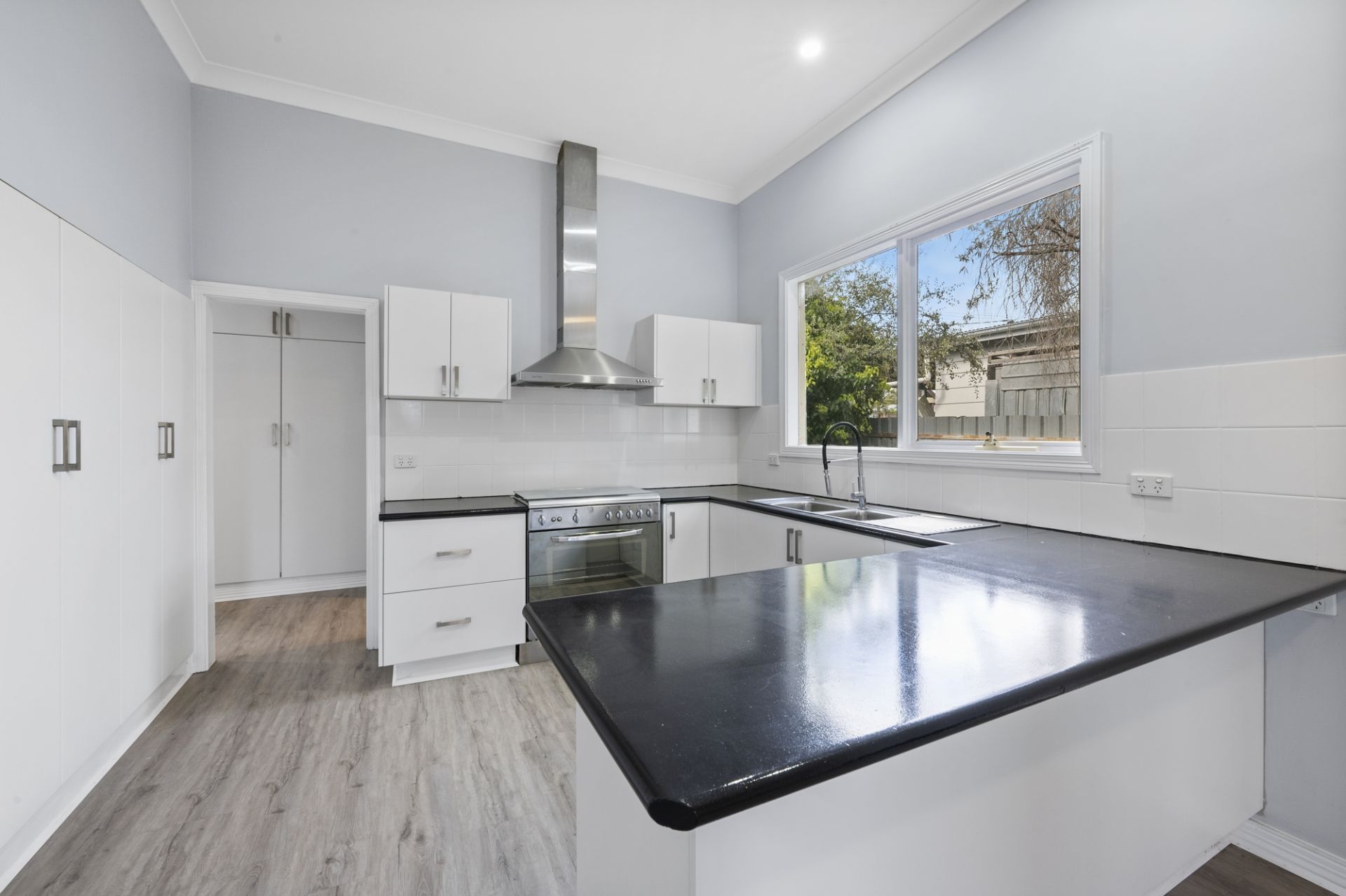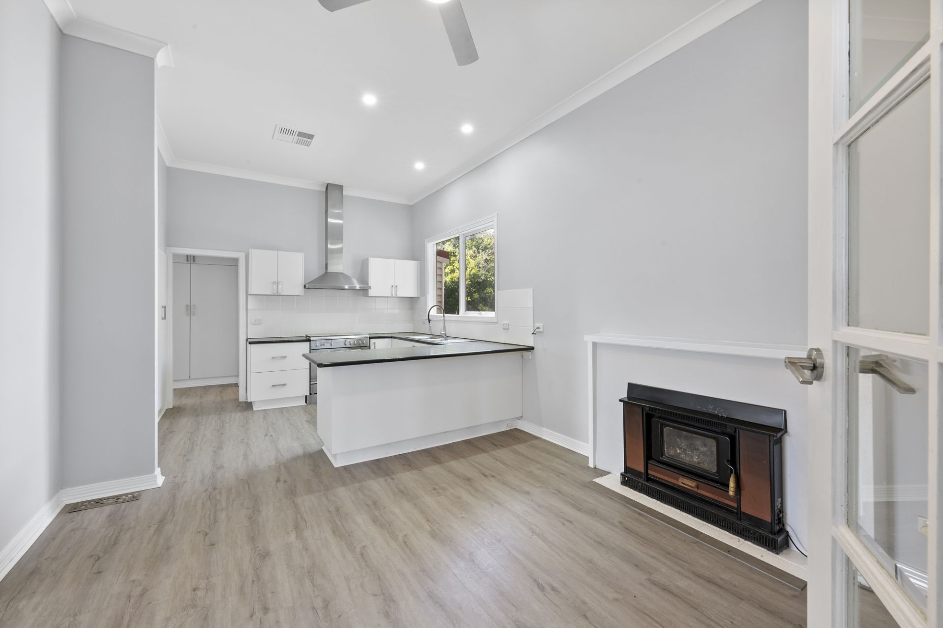 Featuring high decorative ceilings, sash windows, and an original fireplace, the property exudes classic elegance. The home includes three spacious, light-filled bedrooms, one with a fireplace, and an open-plan living, dining, and kitchen area. The modern kitchen boasts soft-close cabinetry, a 900mm stainless steel electric oven with gas cooktop, dishwasher, and ample pantry space. A charming wood fire in the dining area adds warmth and character, flowing into a large living room perfect for family gatherings.