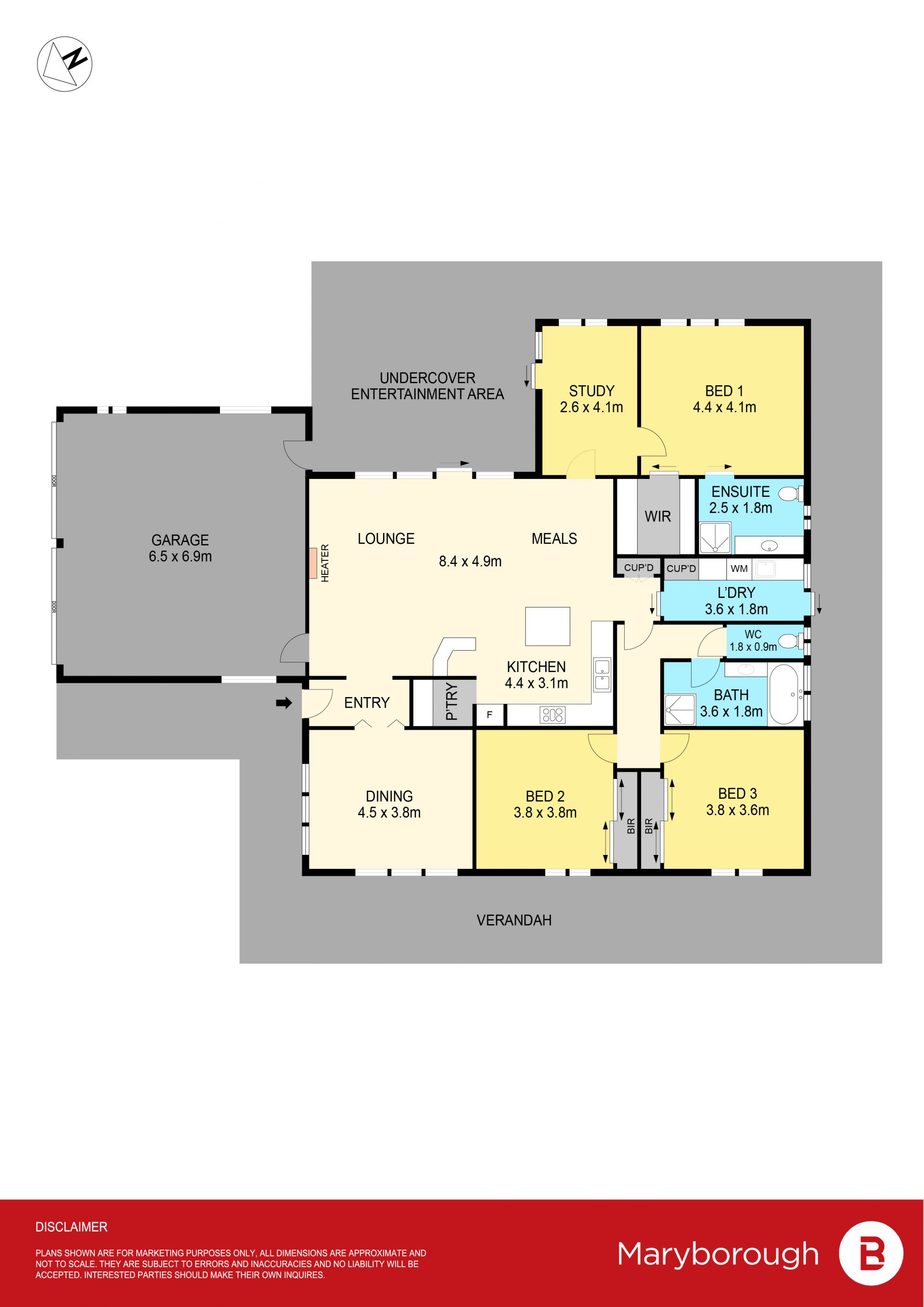Inside, the home features three large bedrooms with built-in robes and split systems, including a master with ensuite and garden views. The open-plan living and dining area is complemented by a quality kitchen with Mirboo benchtops, walk-in pantry, and built-in bar - perfect for entertaining. A second living area provides flexibility as a formal dining space or potential fourth bedroom, while a study nook opens to the rear patio.