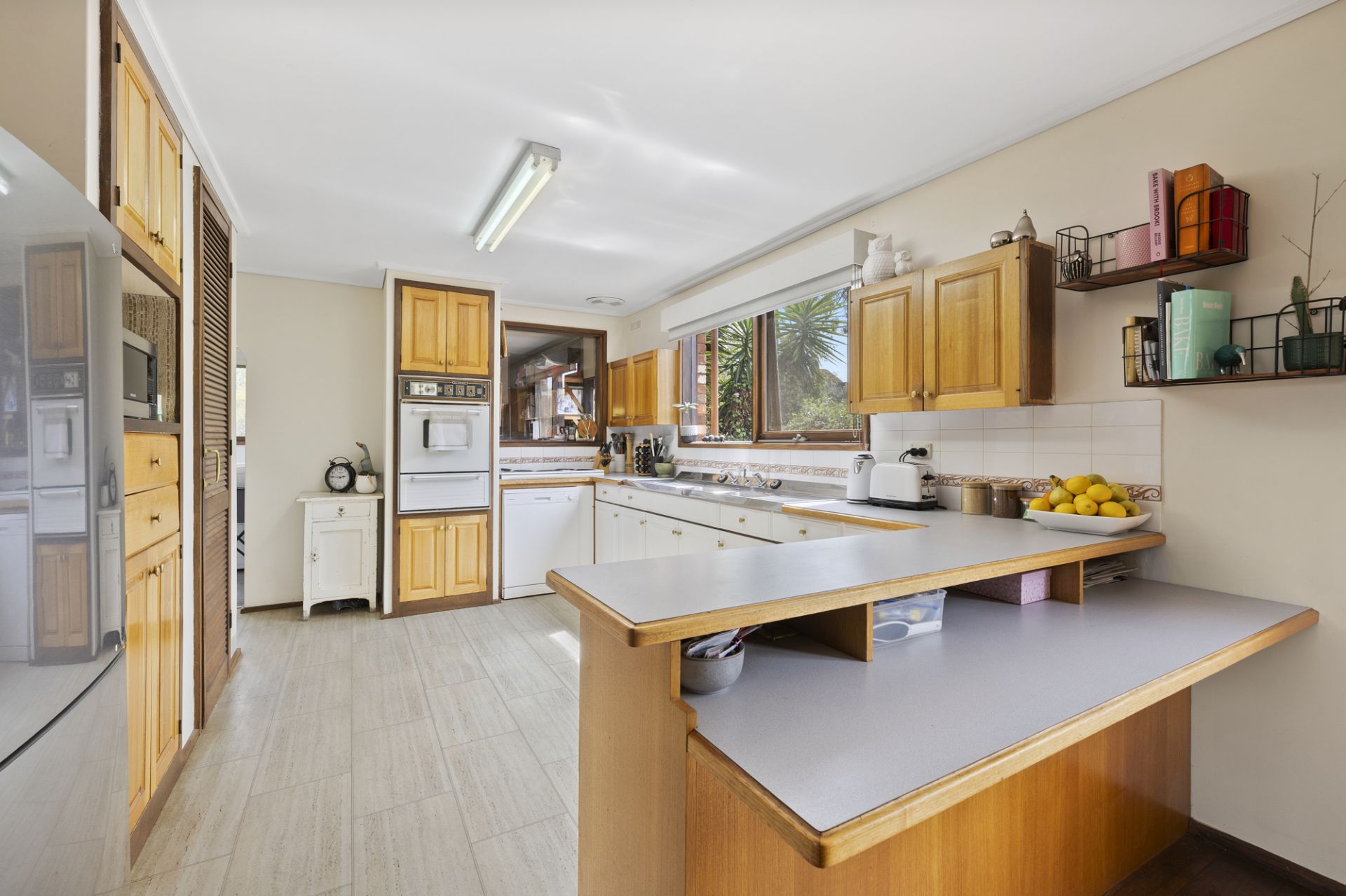 The well-appointed kitchen includes electric cooking, a dishwasher, a walk-in pantry, and breakfast bar, adjoining a light-filled dining area.