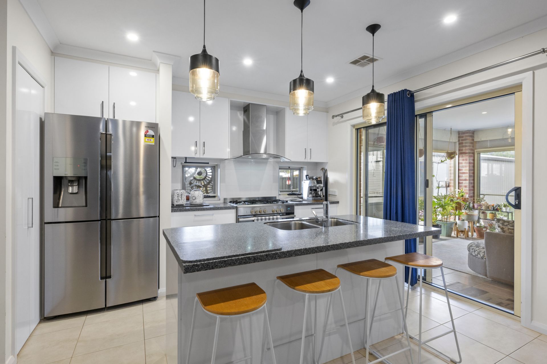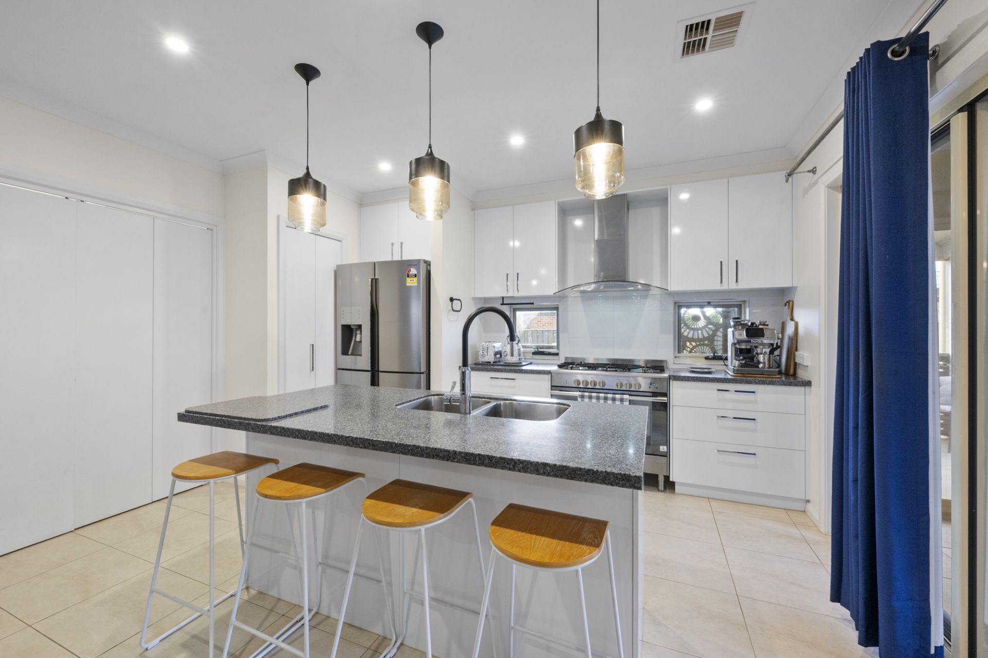 The heart of the home is the open plan living, dining and kitchen area. The modern kitchen impresses with stone benchtops, a walk-in pantry, dishwasher, 900mm gas cooking and pendant lighting over the island bench. A cleverly designed study nook, which can be closed off, provides the perfect work-from-home or homework zone.