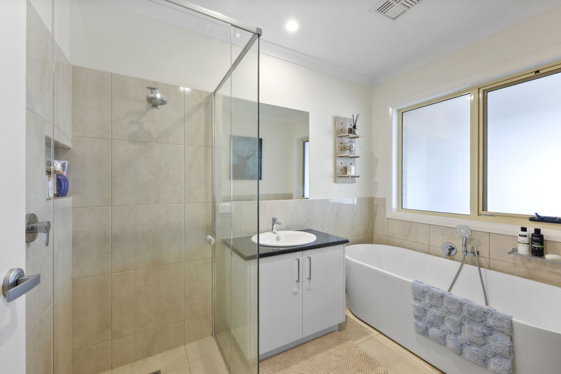 The master bedroom is well appointed with a walk-in robe and full ensuite featuring an oversized shower and double vanity. Two further bedrooms are located towards the rear of the home, both with built-in robes and serviced by the stylish family bathroom with bath, shower and separate toilet.