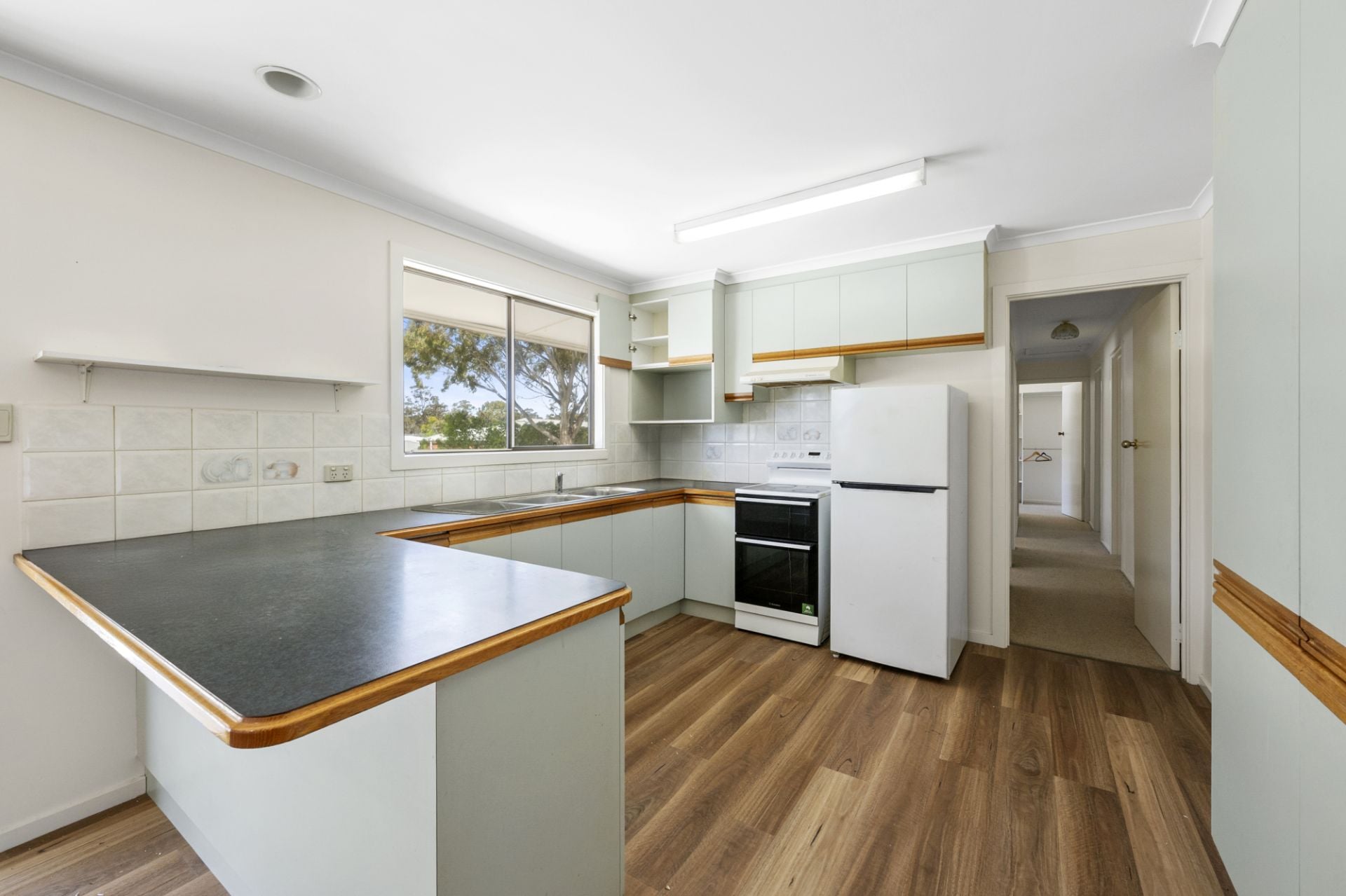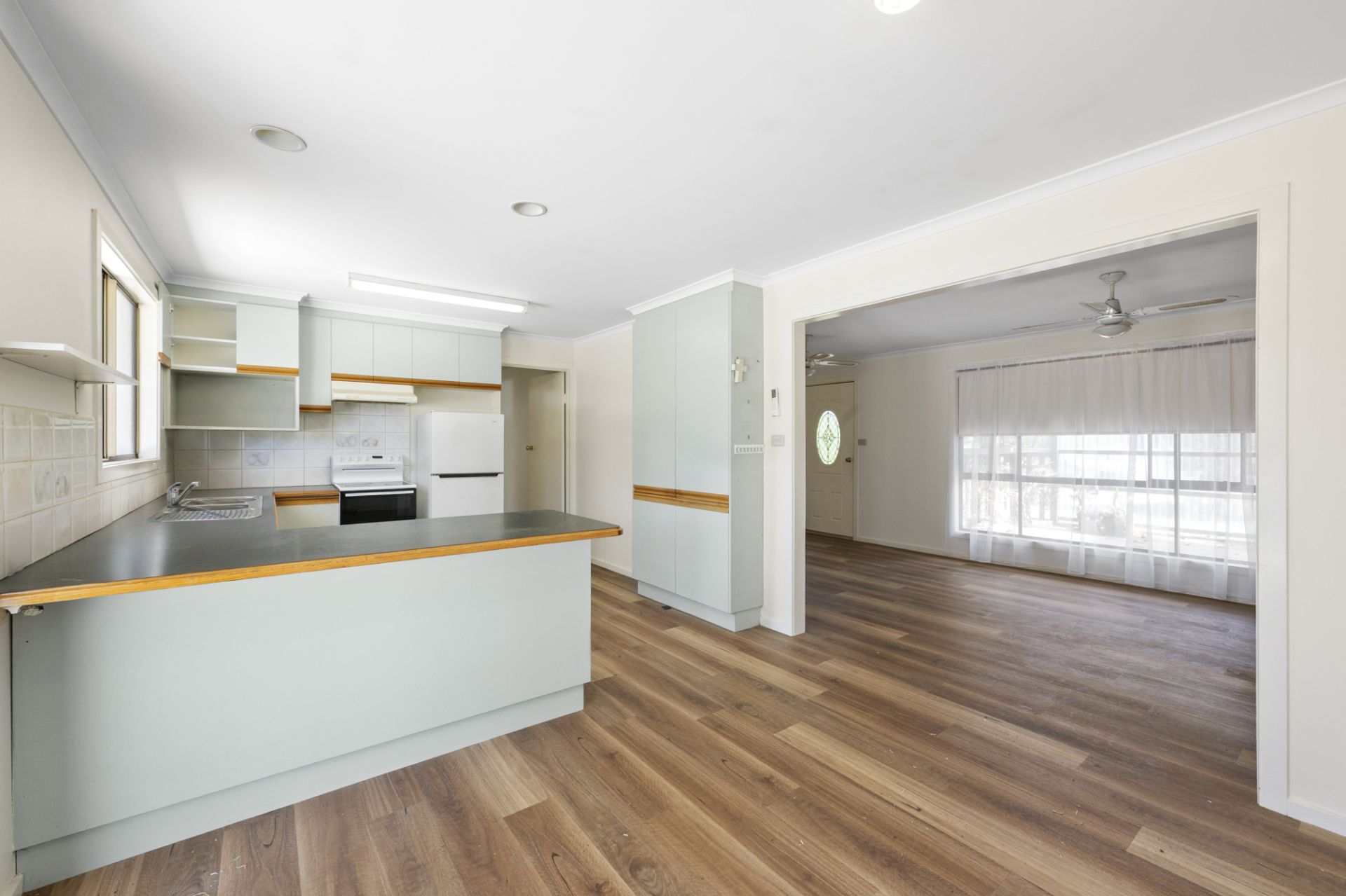 The home welcomes you into a spacious and light-filled living area, complete with ceiling fans and split-system heating and cooling to ensure year-round comfort. The kitchen is thoughtfully designed and includes an electric oven, double sink, ample storage, and practical bench space-catering perfectly to everyday family living or entertaining.