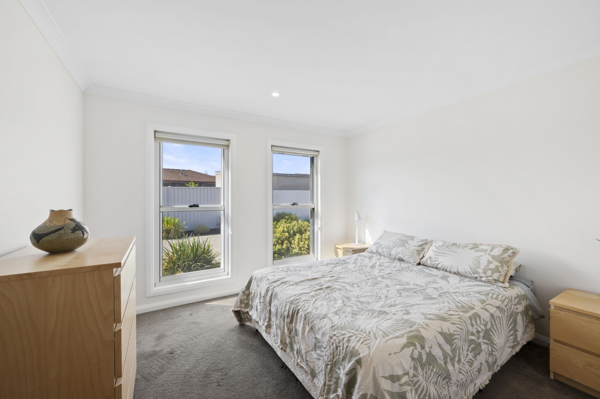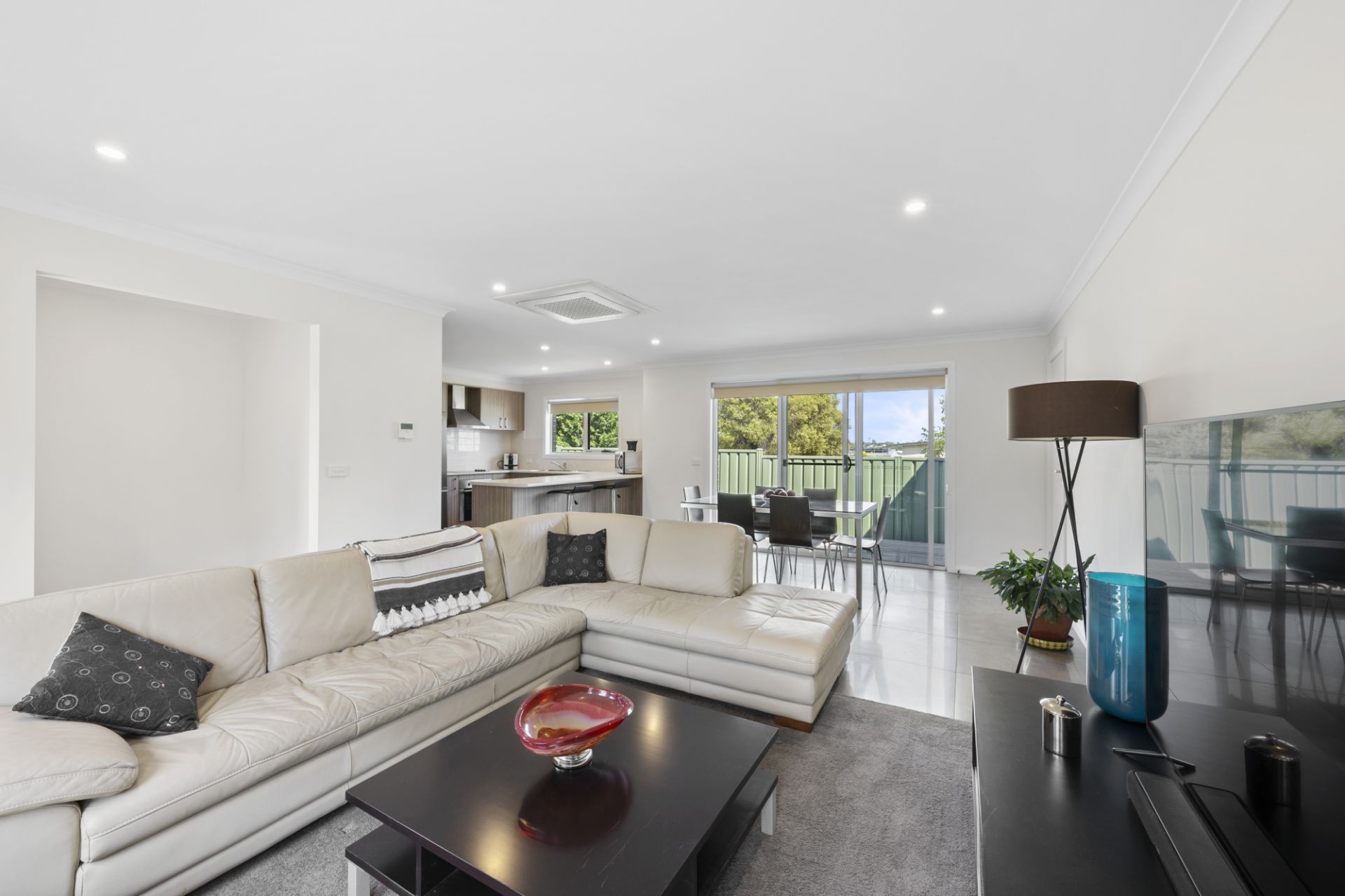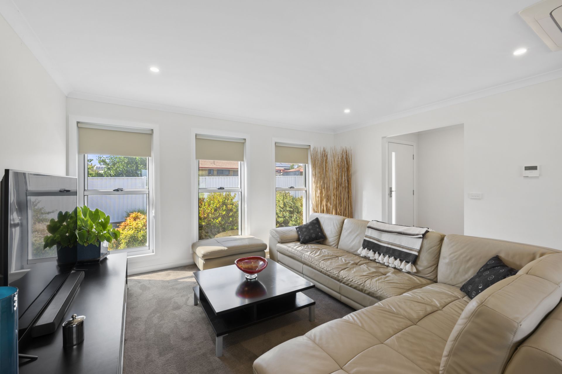 The light-filled open-plan living zone features reverse-cycle refrigerated heating and cooling, carpeted lounge, blinds throughout, double-glazed windows, flyscreens and solar back to grid.
