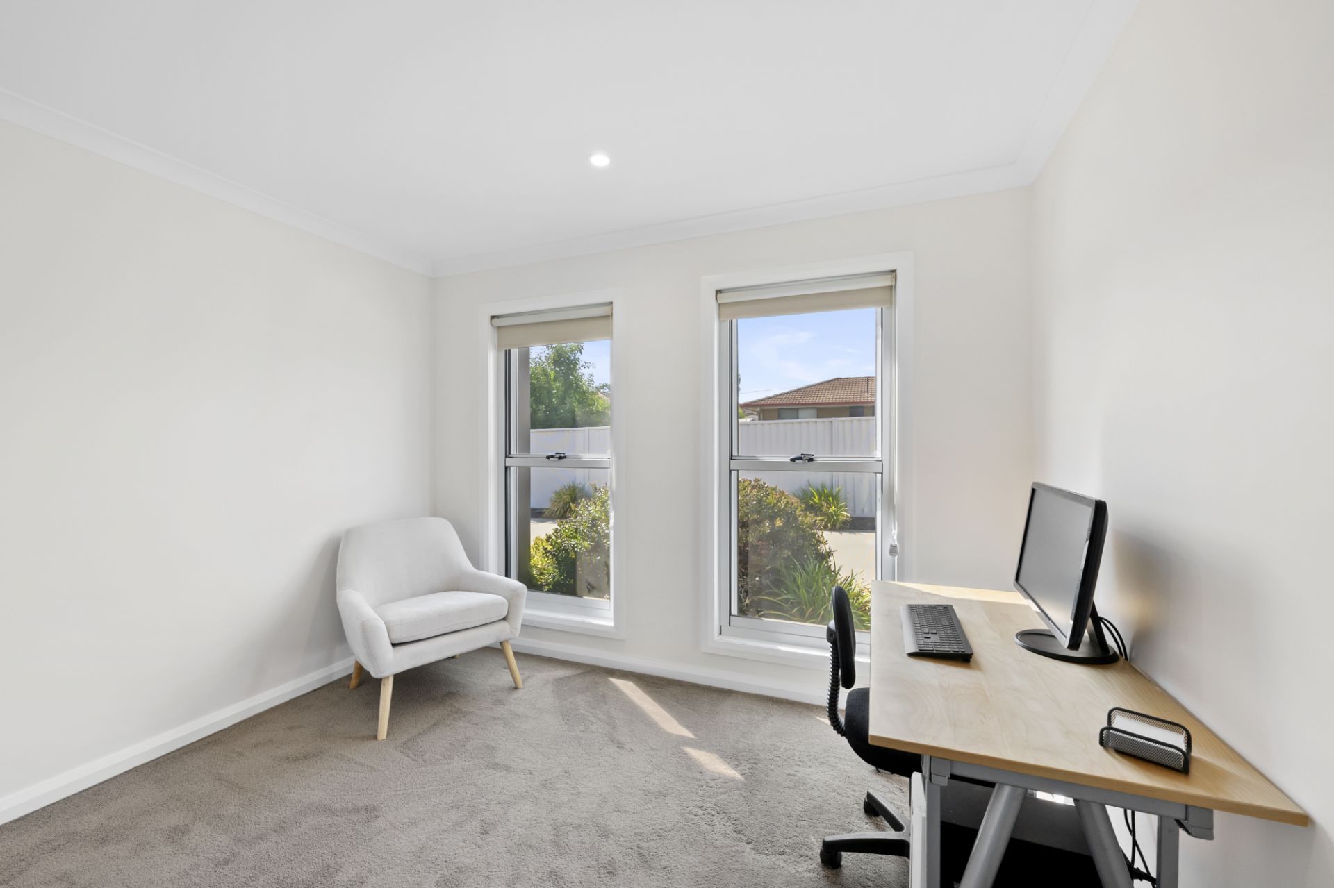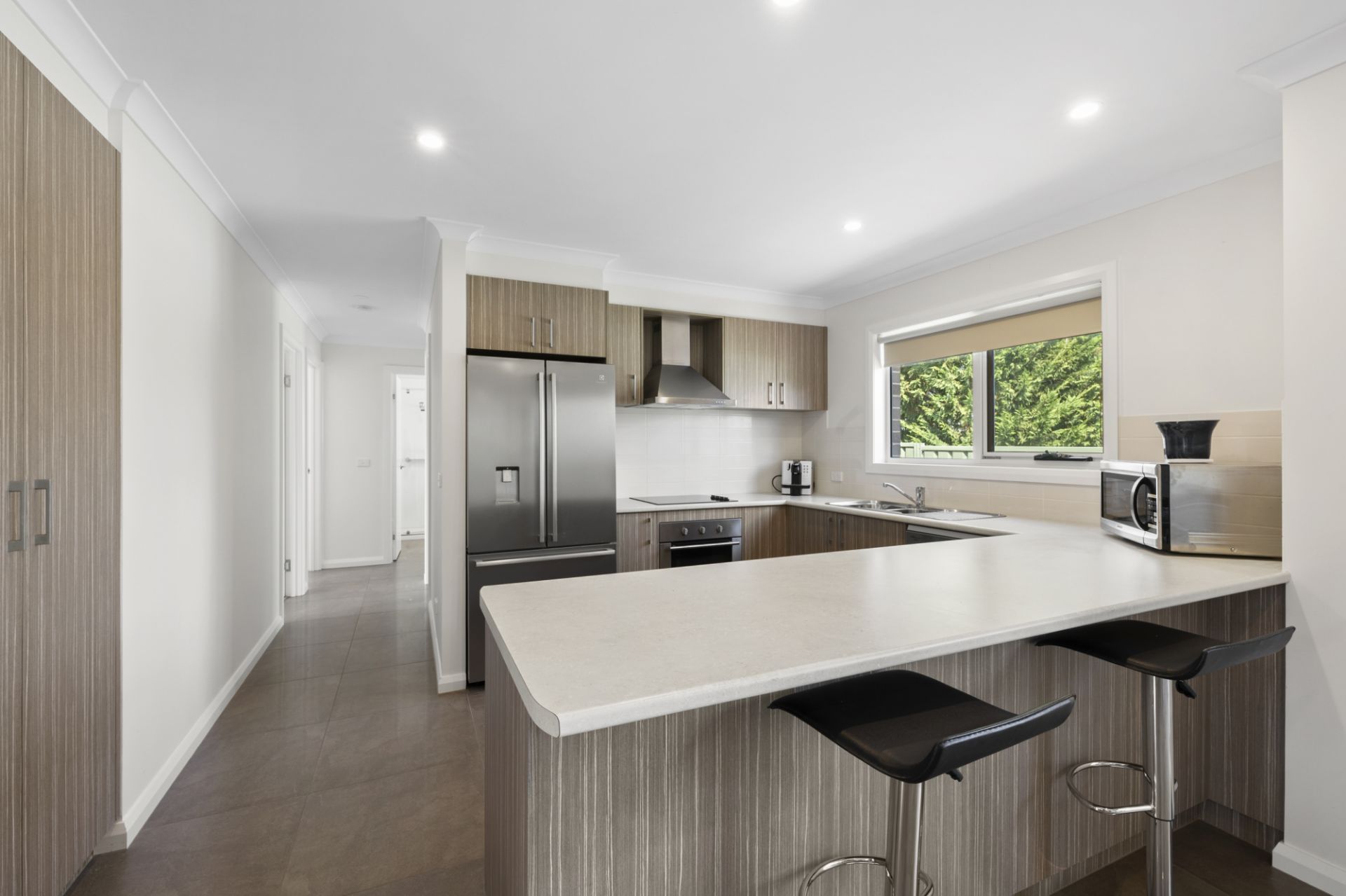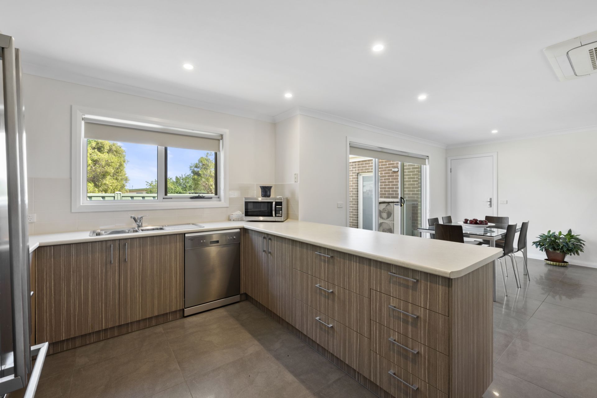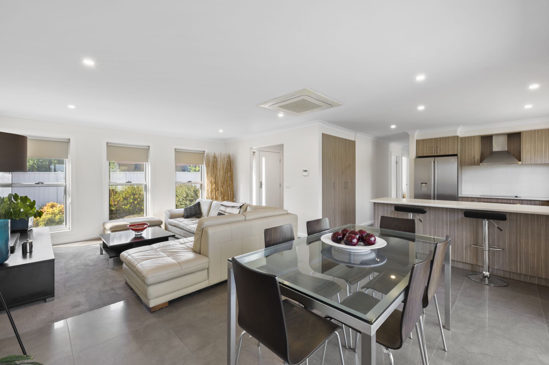 The light-filled open-plan living zone features reverse-cycle refrigerated heating and cooling, carpeted lounge, blinds throughout, double-glazed windows, flyscreens and solar back to grid.