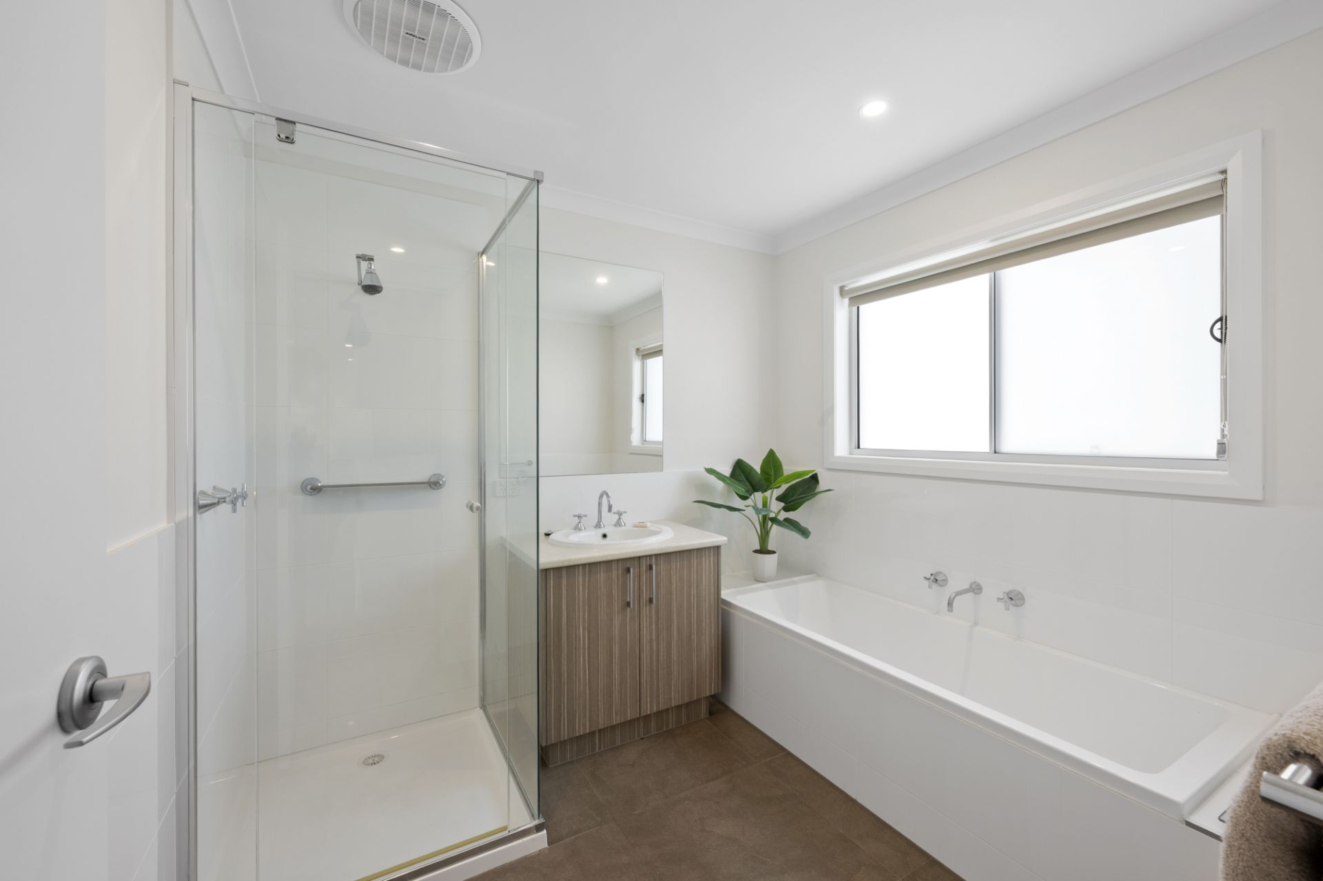 The central bathroom offers a large shower, deep bath, vanity and natural light, complemented by a separate toilet and laundry with great storage.