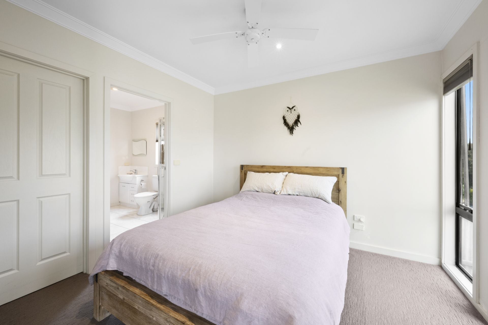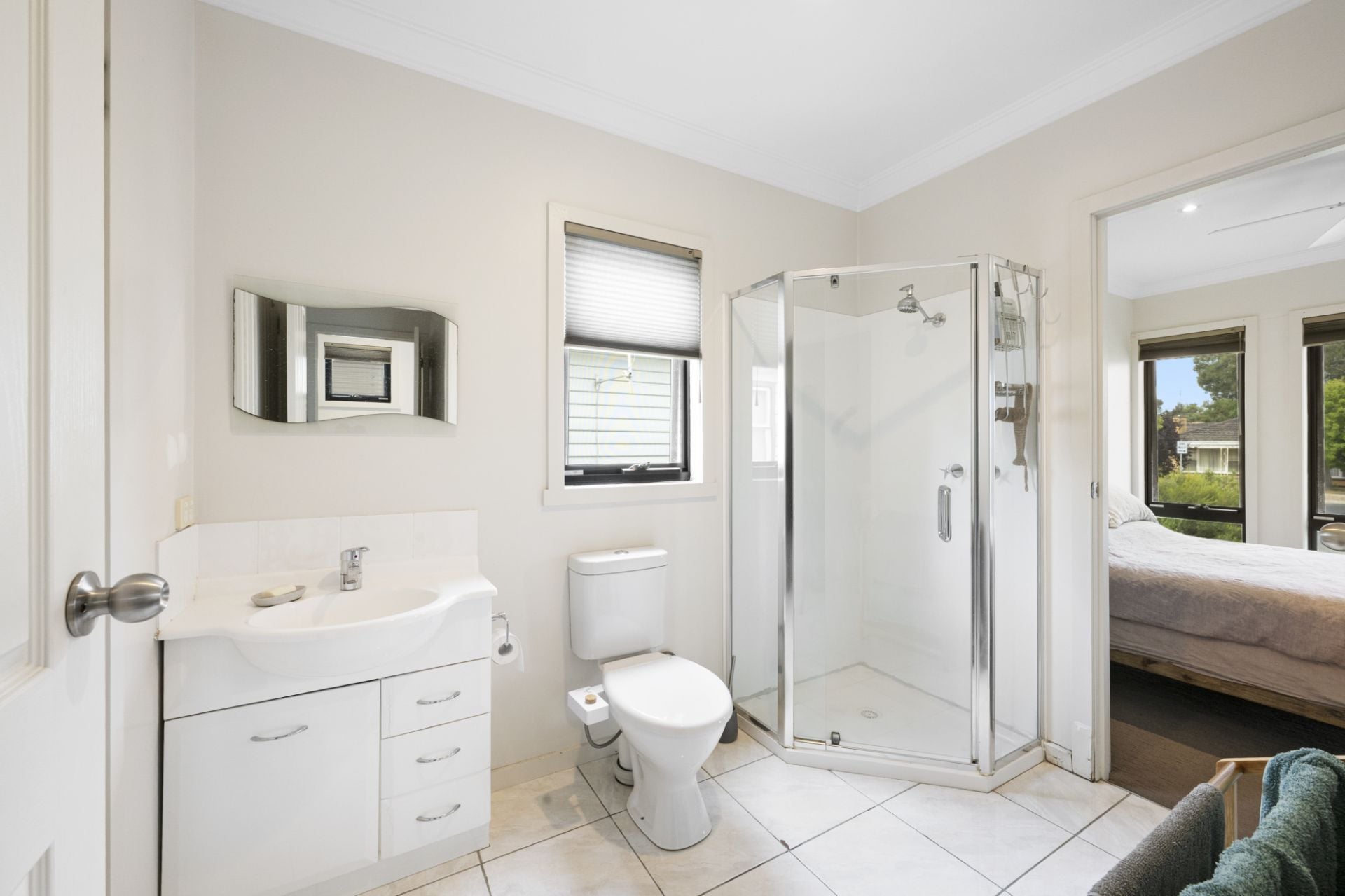 The generously sized main bedroom features a walk-in robe, providing excellent storage, and enjoys dual access to the central bathroom. The bathroom is well-appointed with a shower, vanity, and toilet, offering both practicality and privacy.