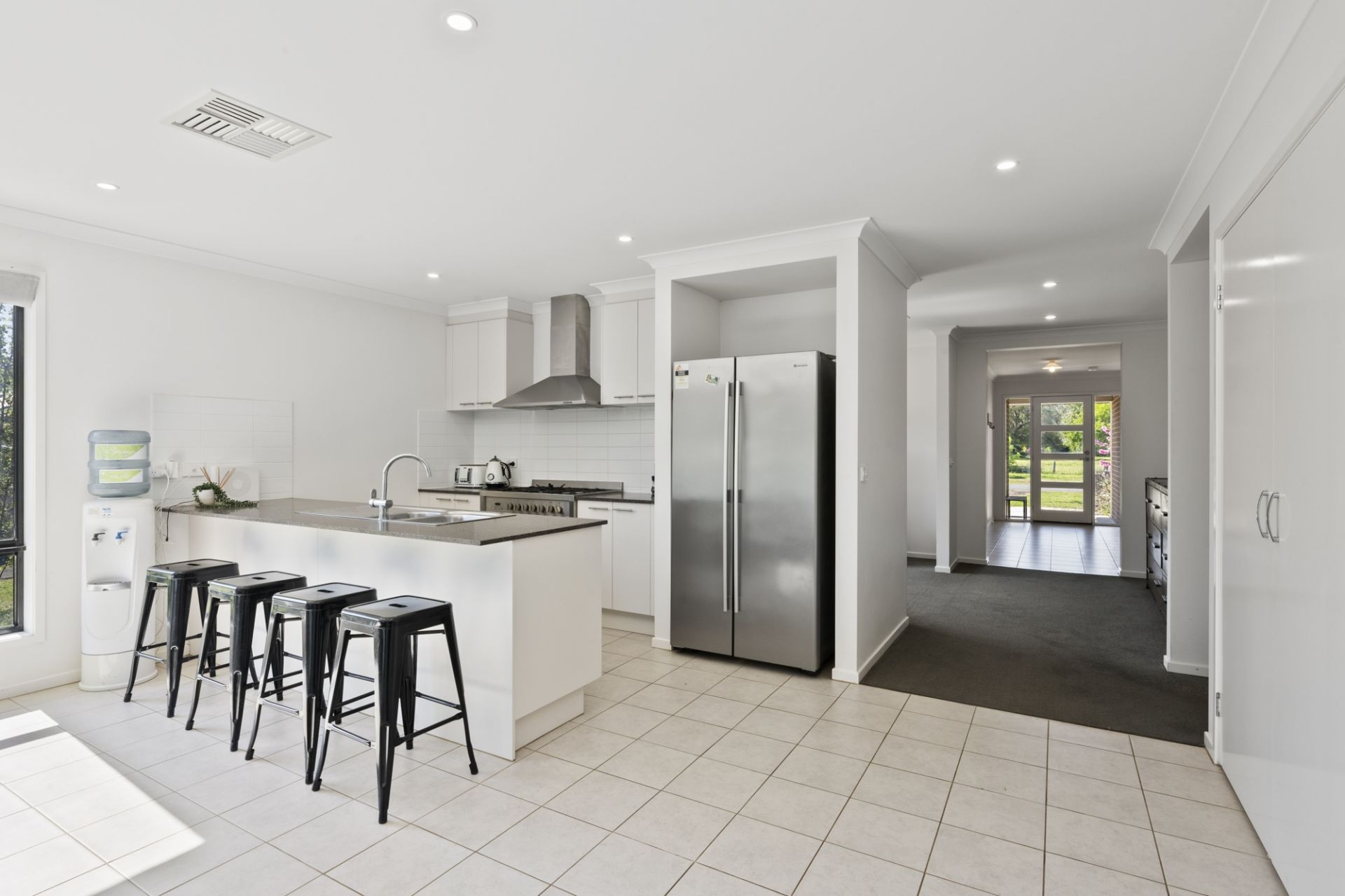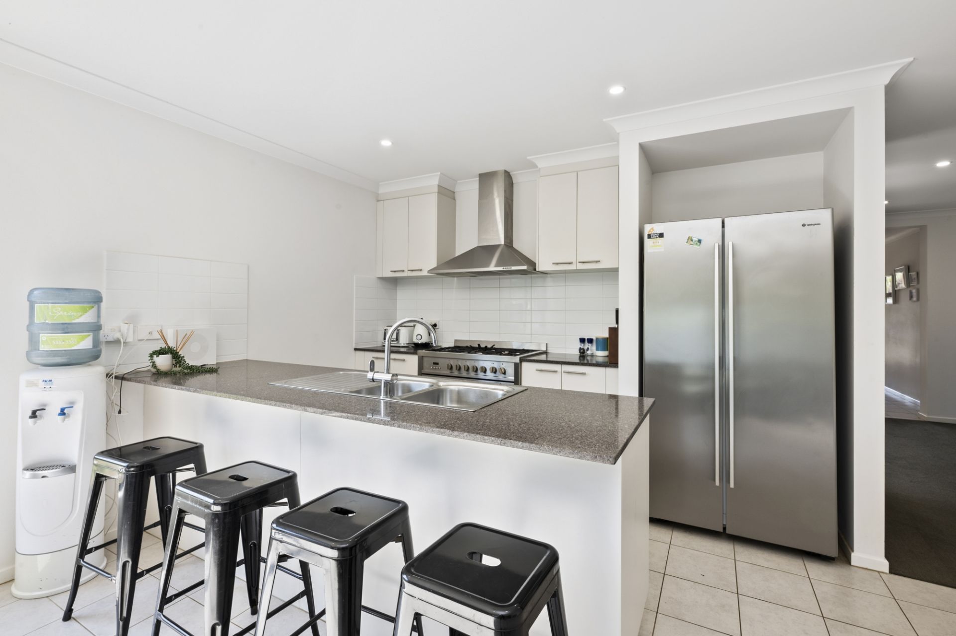 The open-plan living area is flooded with natural light, featuring a tiled kitchen with stone benchtops, a 900mm stainless steel gas cooker, a dishwasher, and a large walk-in pantry. There's ample fridge space for a double-door unit. The home has both evaporative cooling and ducted heating throughout for year-round comfort.