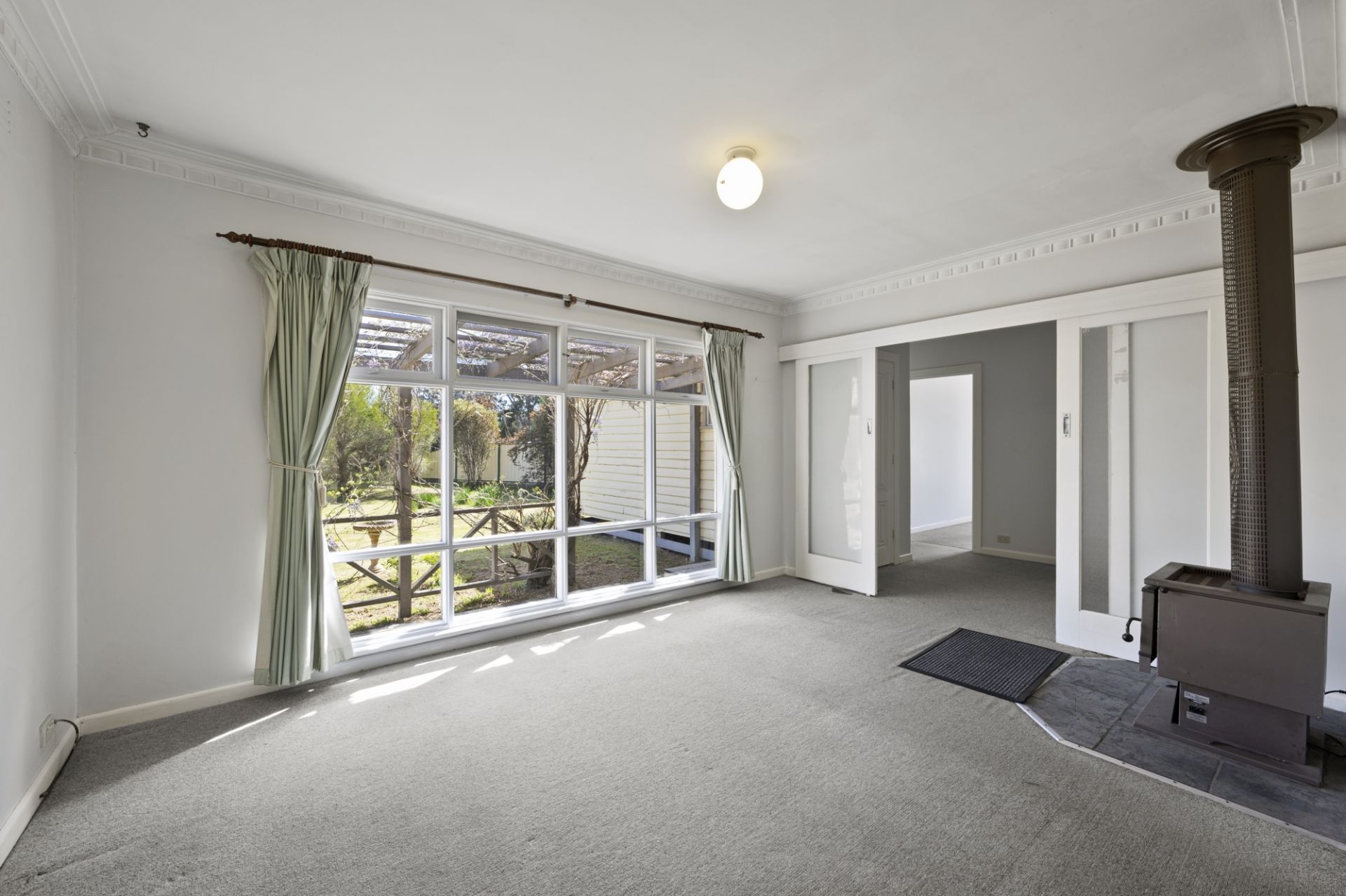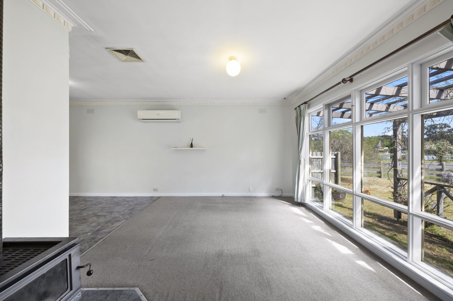 At the front, the entry hall includes handy storage, while the kitchen provides ample cupboard space, a freestanding LPG gas cooker with rangehood, and adjoins the dining area with access to patio The lounge includes both a reverse cycle split system and wood heater, offering comfort throughout the seasons.